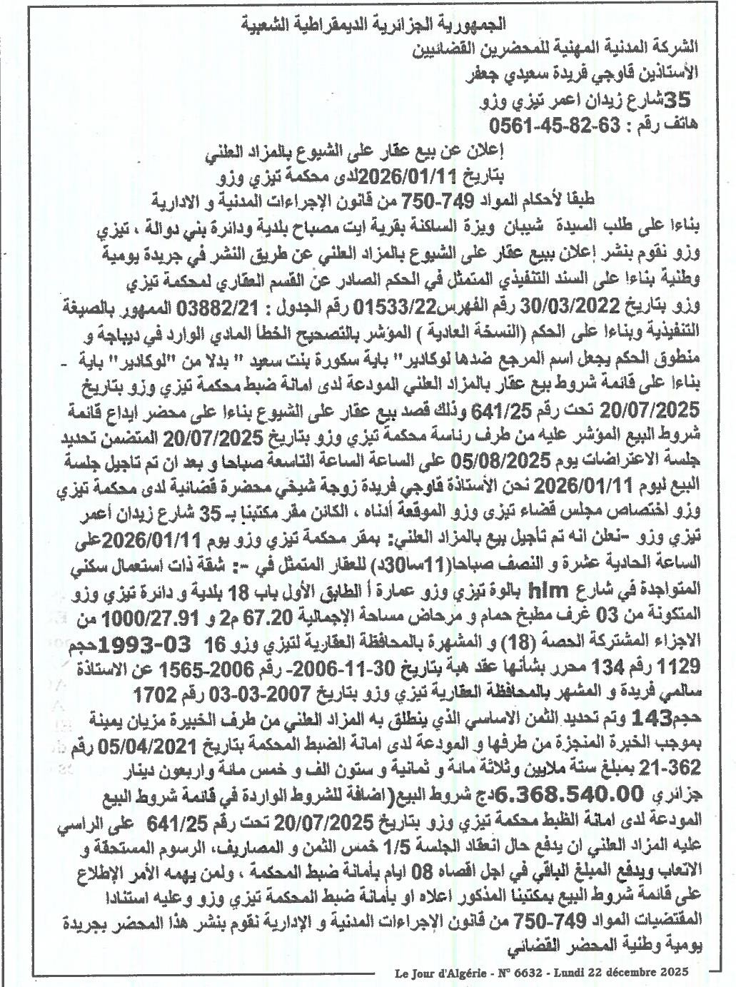 Il sera procédé à la vente au plus offrant et dernier enchérisseur le :