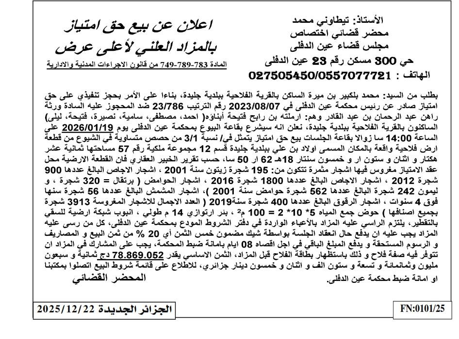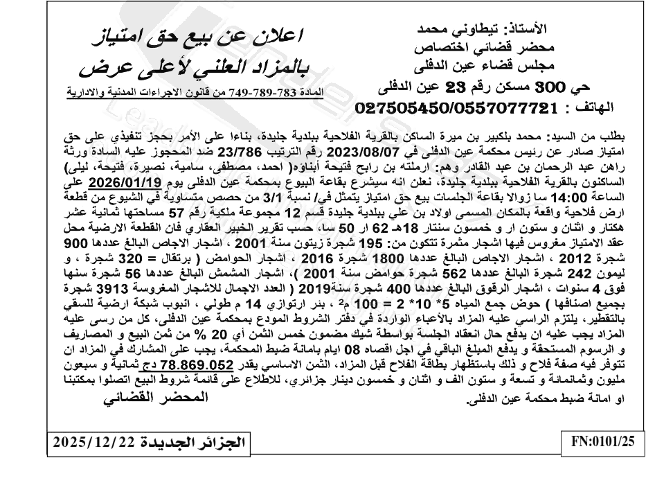 Il sera procédé à la vente au plus offrant et dernier enchérisseur le : 19/01/2026';