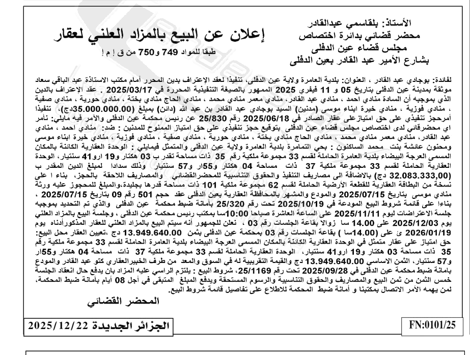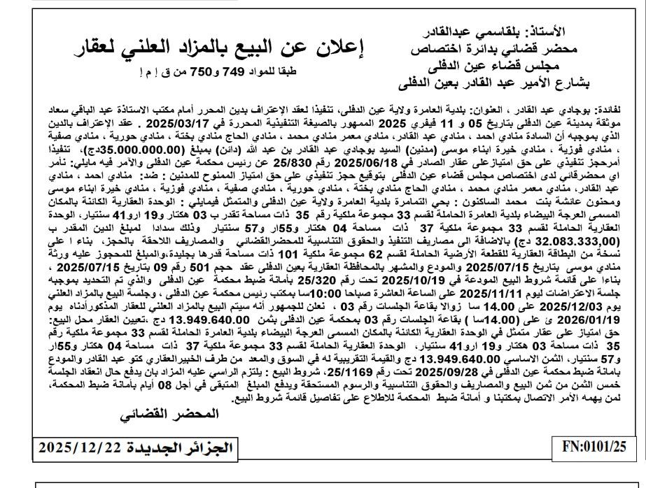 Il sera procédé à la vente au plus offrant et dernier enchérisseur le : 19/01/2026';