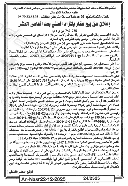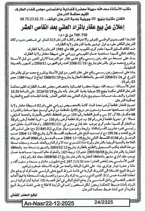 Il sera procédé à la vente au plus offrant et dernier enchérisseur le : 29/12/2025';