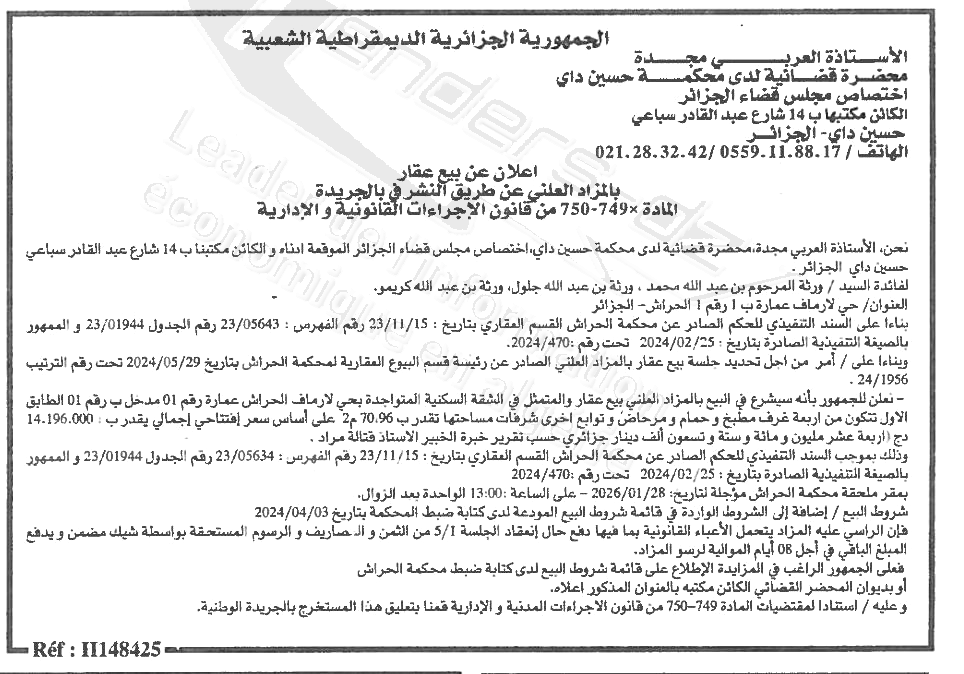 Il sera procédé à la vente au plus offrant et dernier enchérisseur le :