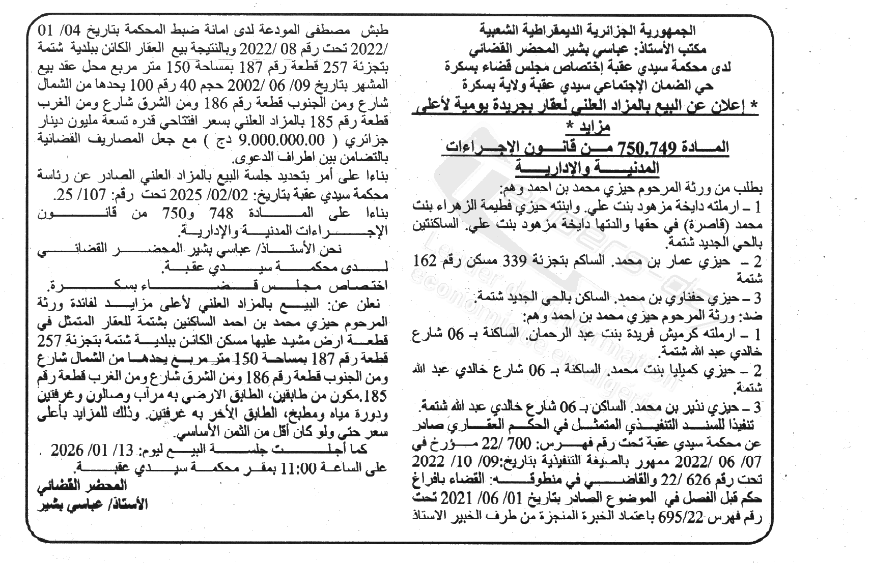 Il sera procédé à la vente au plus offrant et dernier enchérisseur le :