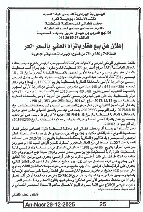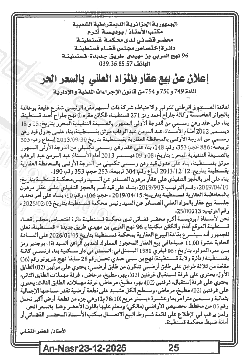 Il sera procédé à la vente au plus offrant et dernier enchérisseur le : 30/12/2025';