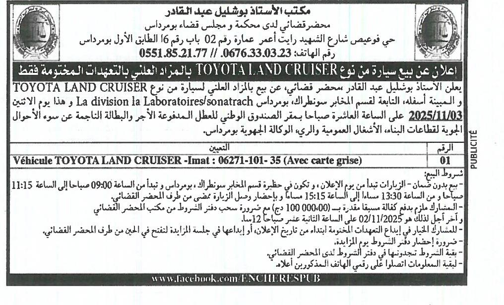 | Objet: Vente d’un véhicule de type TOYOTA LAND. | |