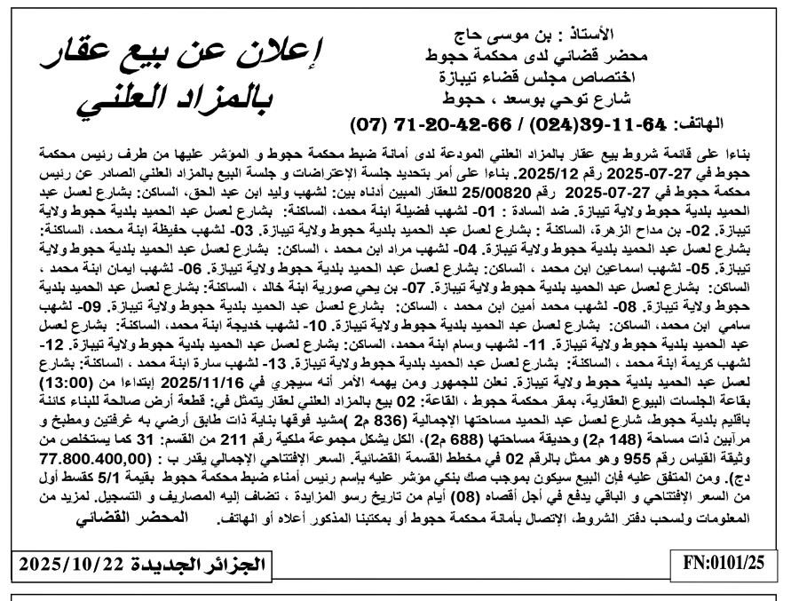 Il sera procédé à la vente au plus offrant et dernier enchérisseur le :