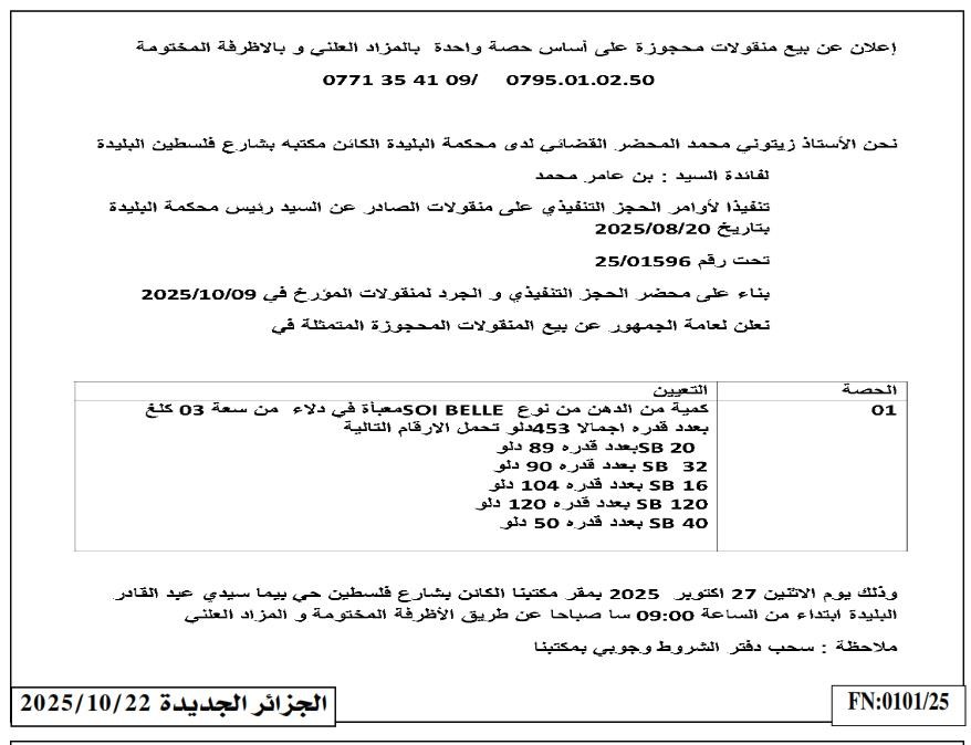 Il sera procédé à la vente au plus offrant et dernier enchérisseur le :