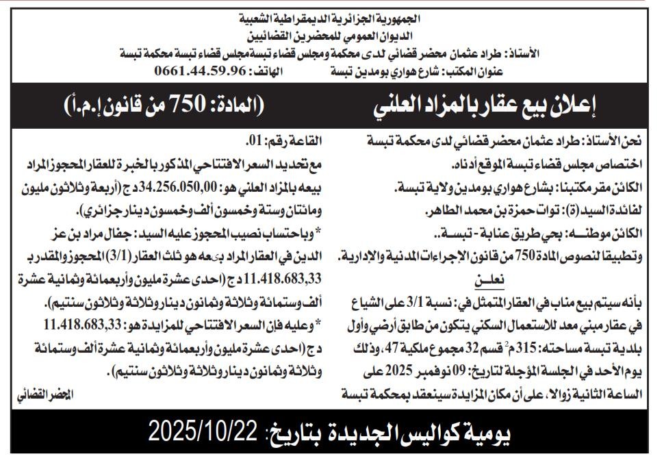 Il sera procédé à la vente au plus offrant et dernier enchérisseur le :