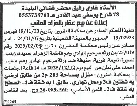 Il sera procédé à la vente au plus offrant et dernier enchérisseur le :