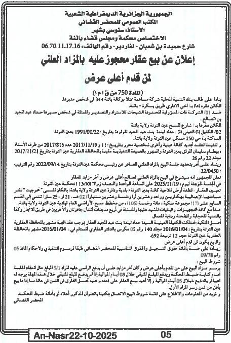 Il sera procédé à la vente au plus offrant et dernier enchérisseur le :