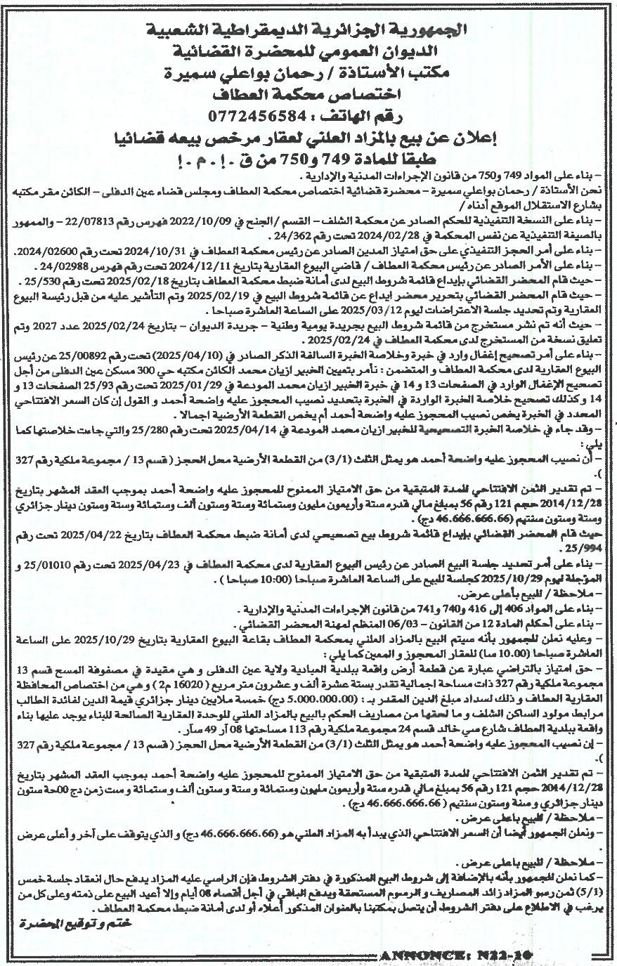 Il sera procédé à la vente au plus offrant et dernier enchérisseur le :
