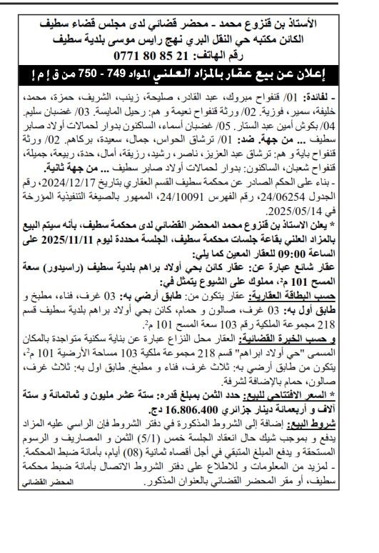 Il sera procédé à la vente au plus offrant et dernier enchérisseur le :