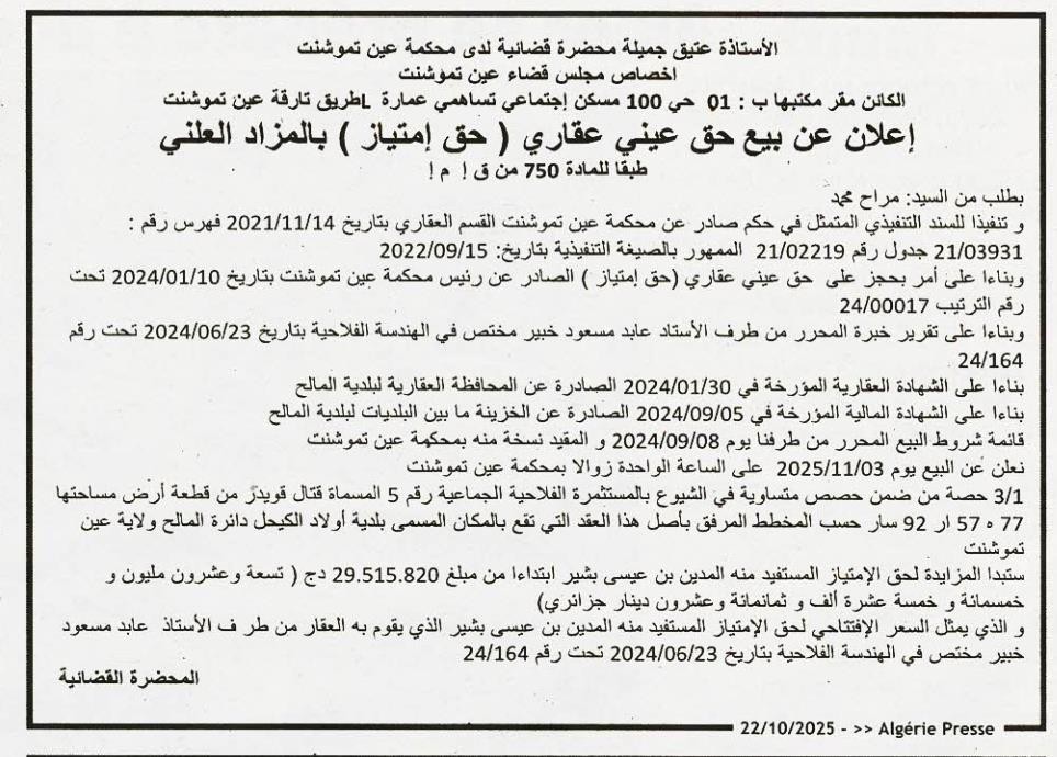 Il sera procédé à la vente au plus offrant et dernier enchérisseur le :