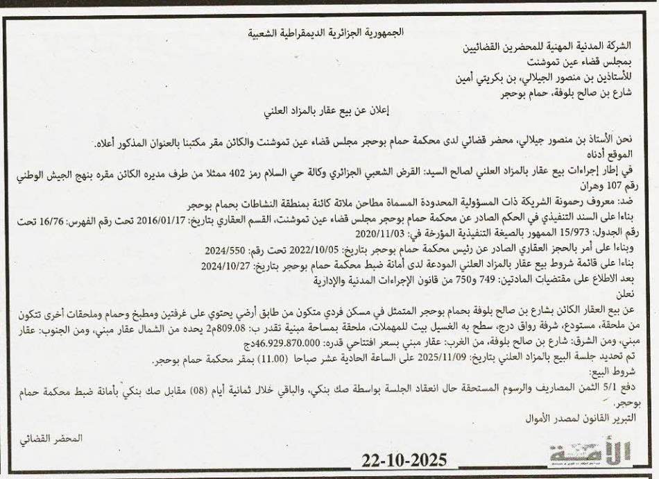 Il sera procédé à la vente au plus offrant et dernier enchérisseur le : 29/10/2025';