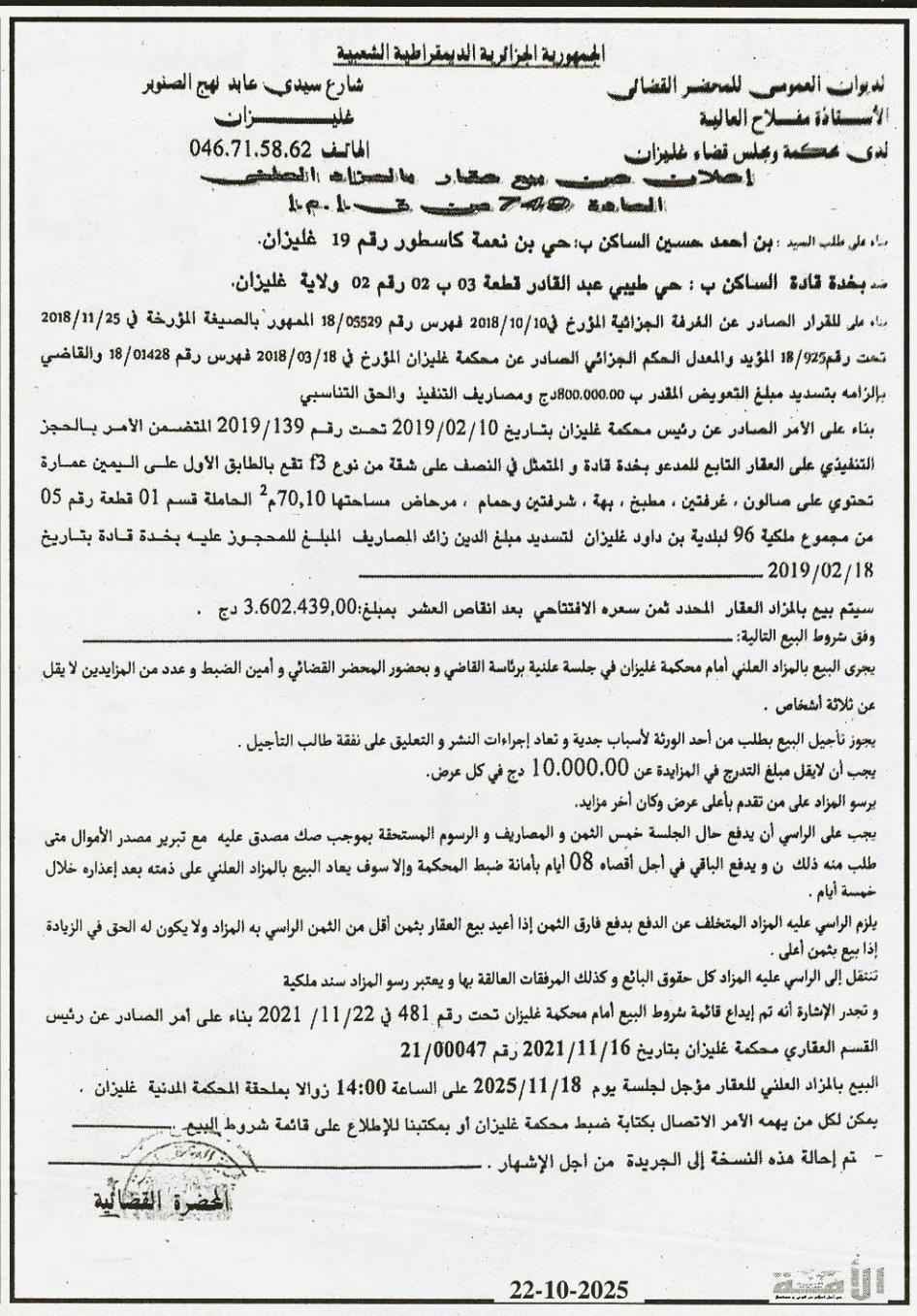 Il sera procédé à la vente au plus offrant et dernier enchérisseur le :