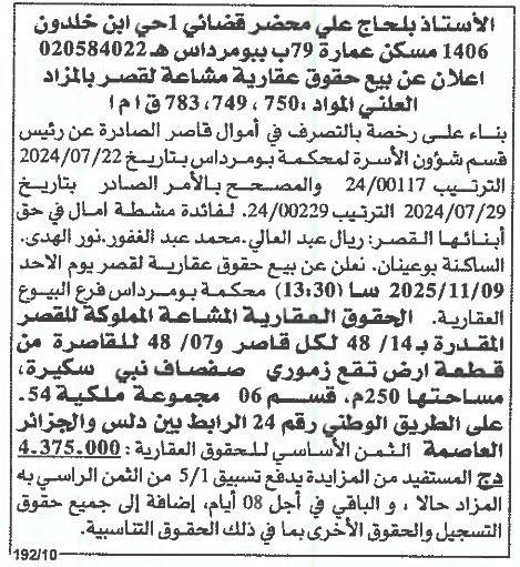 Il sera procédé à la vente au plus offrant et dernier enchérisseur le :