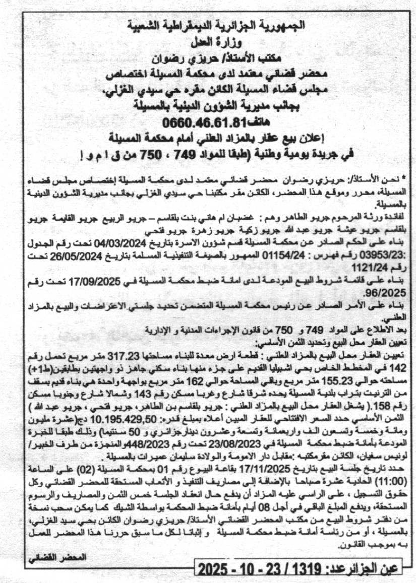 Il sera procédé à la vente au plus offrant et dernier enchérisseur le :