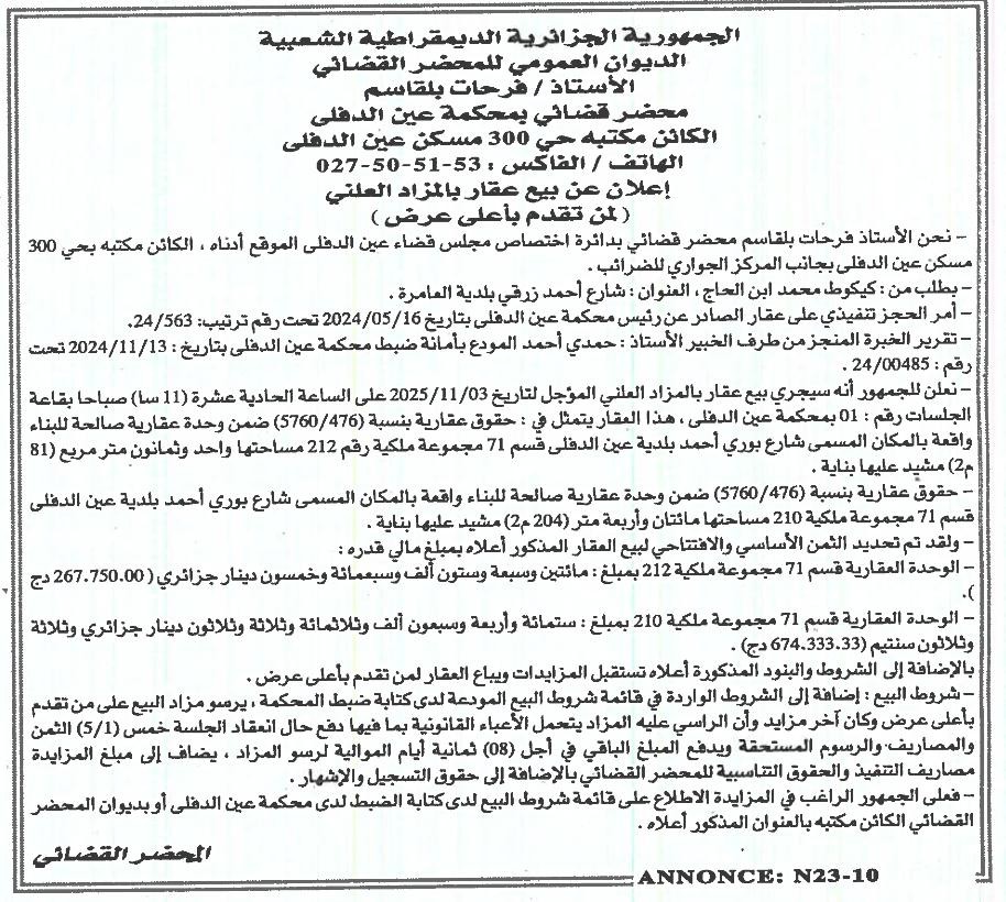 Il sera procédé à la vente au plus offrant et dernier enchérisseur le :