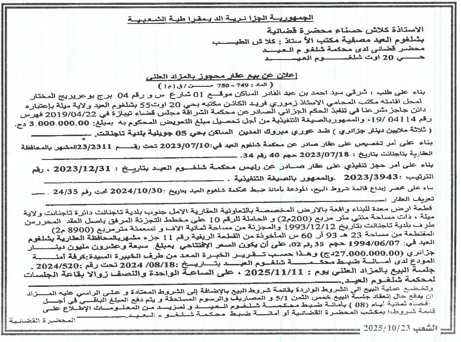 Il sera procédé à la vente au plus offrant et dernier enchérisseur le :