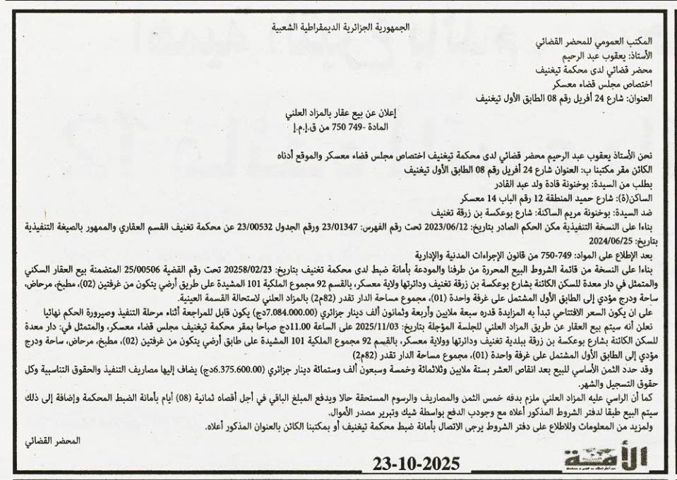 Il sera procédé à la vente au plus offrant et dernier enchérisseur le :