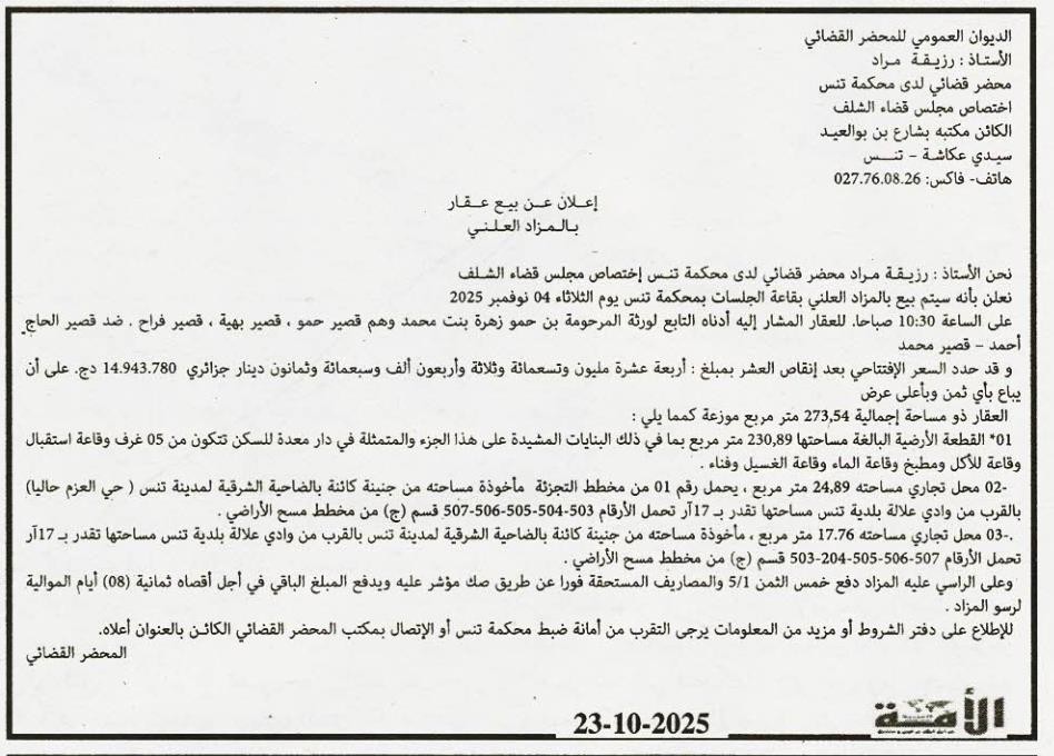 Il sera procédé à la vente au plus offrant et dernier enchérisseur le :