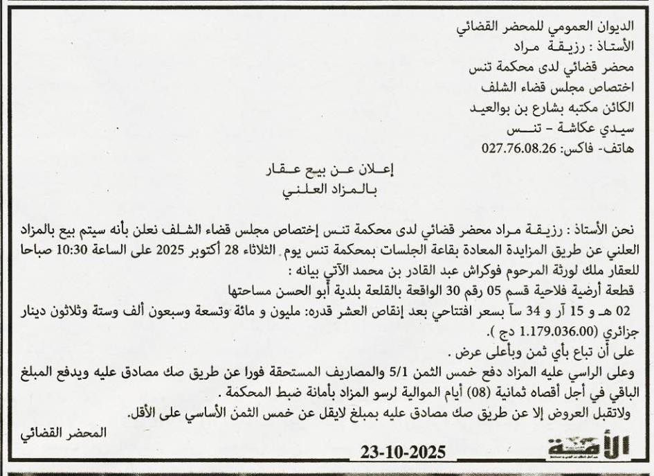 Il sera procédé à la vente au plus offrant et dernier enchérisseur le : 30/10/2025';