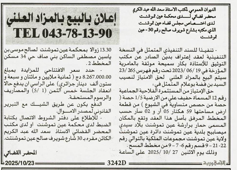 Il sera procédé à la vente au plus offrant et dernier enchérisseur le : 27/10/2025';