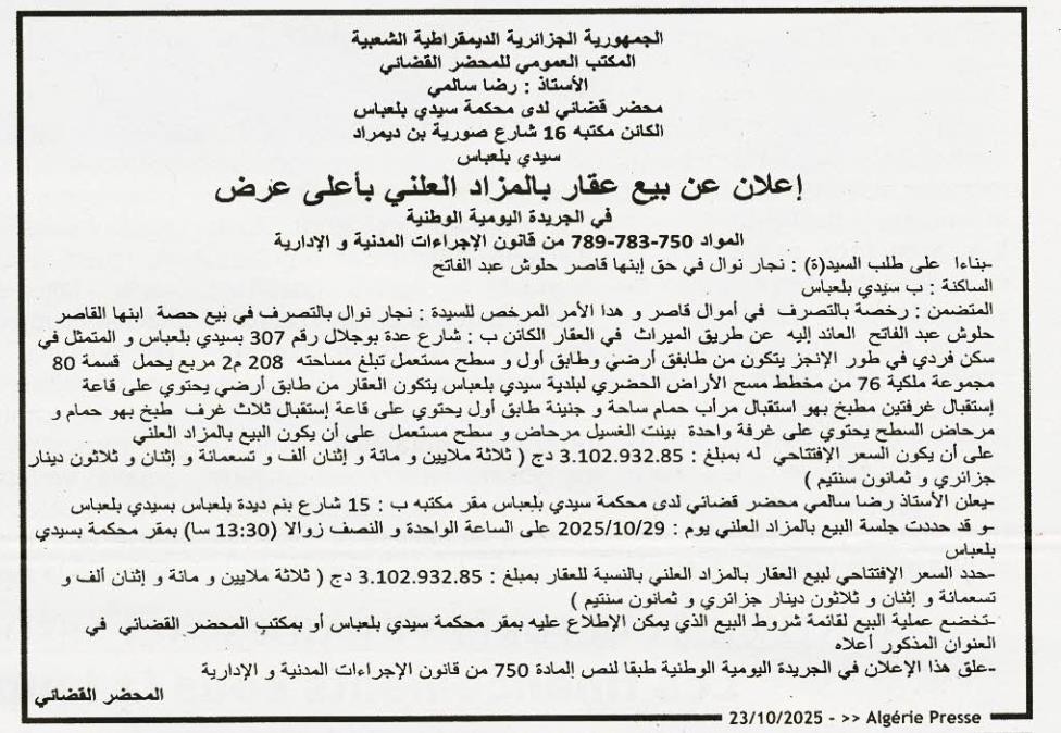 Il sera procédé à la vente au plus offrant et dernier enchérisseur le :