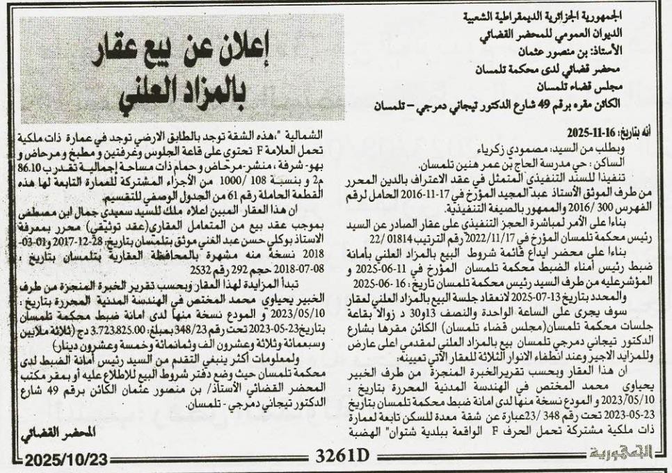Il sera procédé à la vente au plus offrant et dernier enchérisseur le : 16/11/2025';