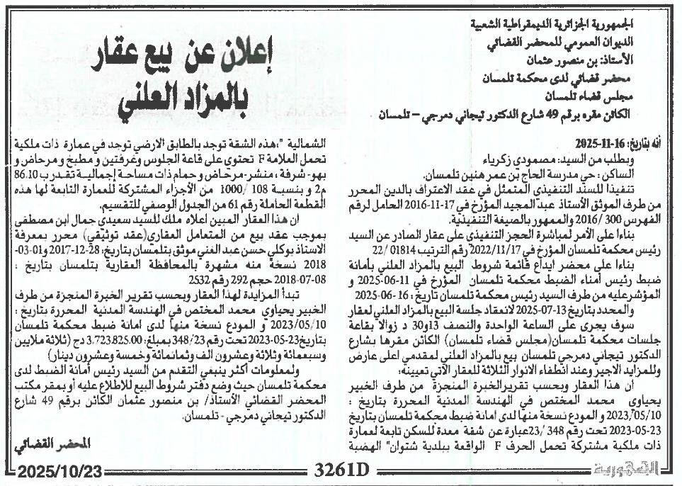 Il sera procédé à la vente au plus offrant et dernier enchérisseur le : 16/11/2025';