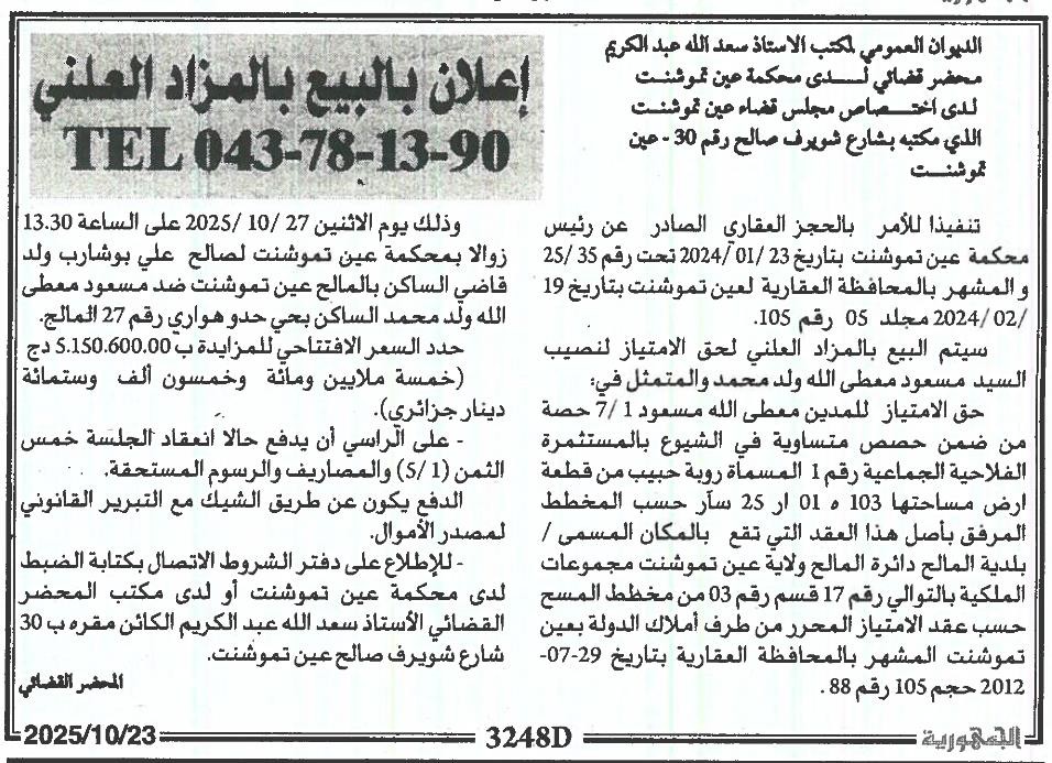 Il sera procédé à la vente au plus offrant et dernier enchérisseur le : 27/10/2025';