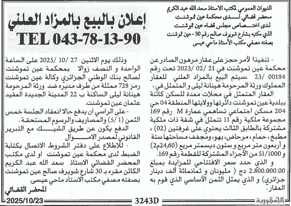 Il sera procédé à la vente au plus offrant et dernier enchérisseur le : 27/10/2025';