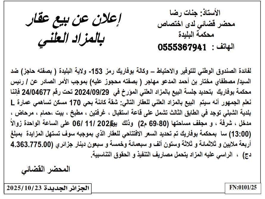 Il sera procédé à la vente au plus offrant et dernier enchérisseur le :