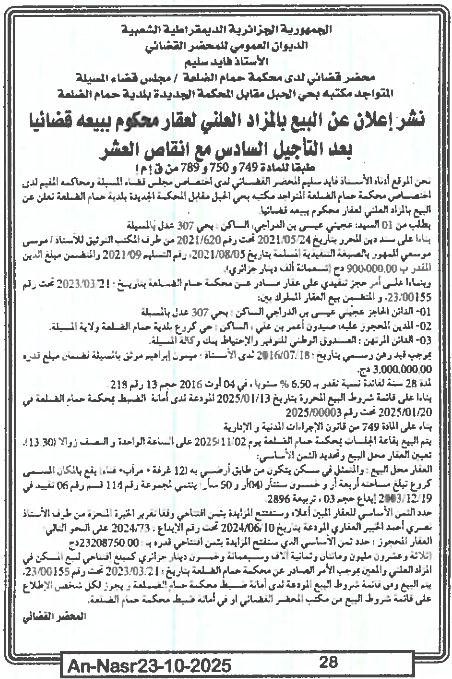 Il sera procédé à la vente au plus offrant et dernier enchérisseur le :