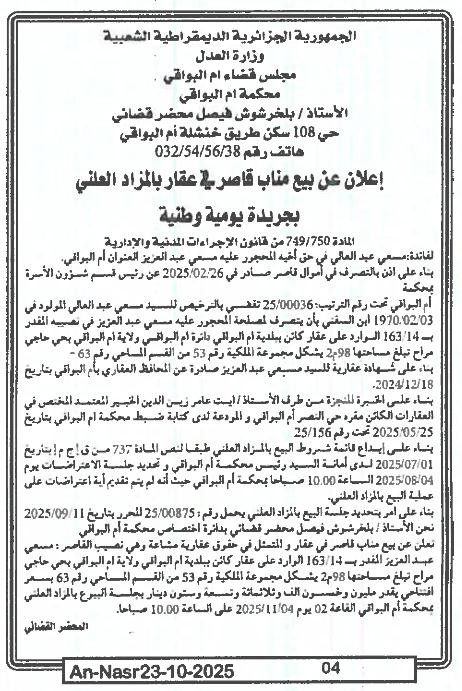 Il sera procédé à la vente au plus offrant et dernier enchérisseur le :