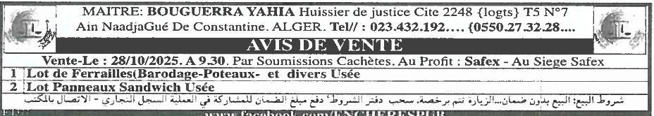 | Objet: Vente de ferrailles (barres, poteaux et divers usés) — 2 lots de panneaux sandwich usés | |