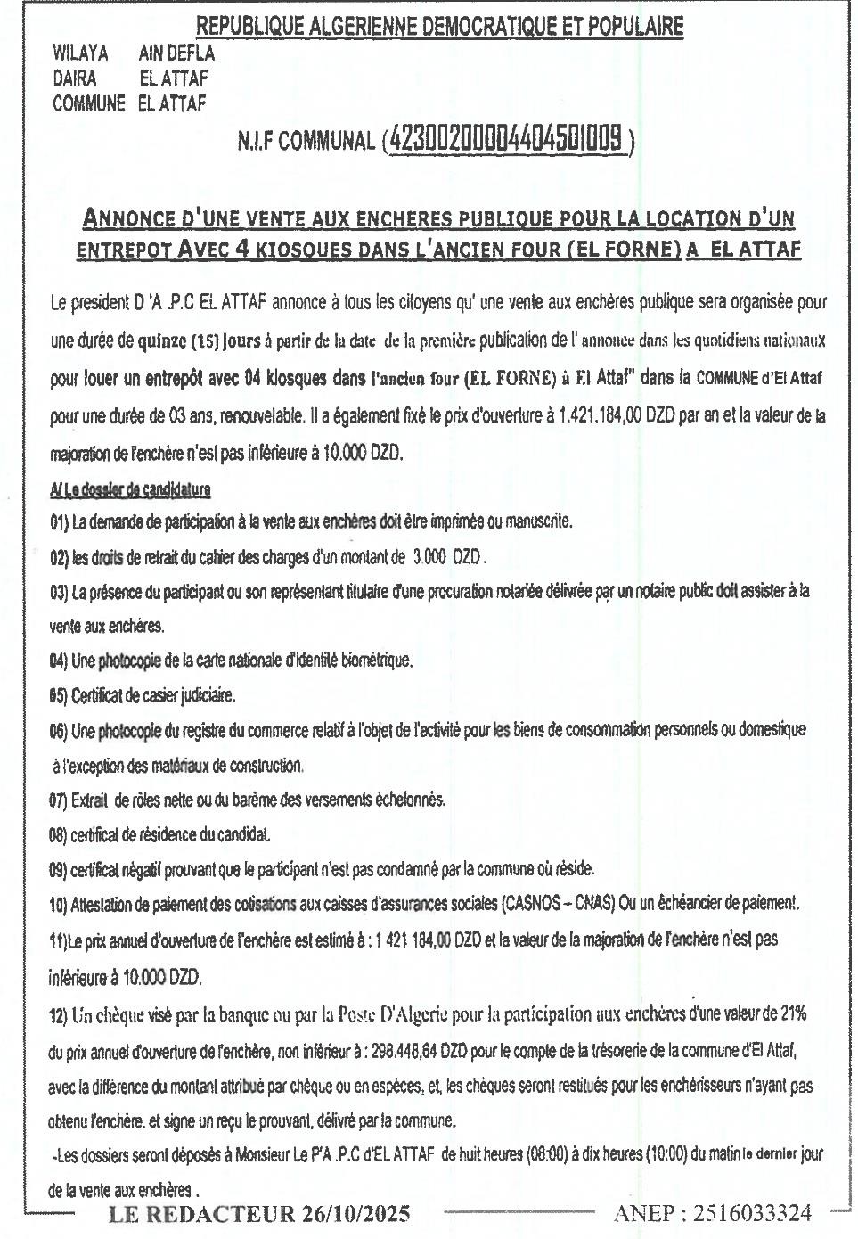 | Objet: Vente aux enchères publique pour la location d'un entrepôt avec 4 kiosques dans l'ancien four (EL FORNE) à El Attaf | |