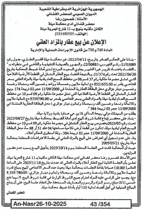 Il sera procédé à la vente au plus offrant et dernier enchérisseur le :