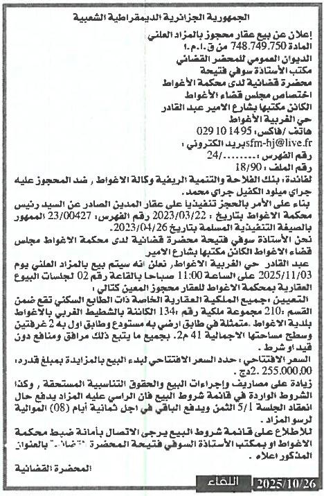 Il sera procédé à la vente au plus offrant et dernier enchérisseur le :