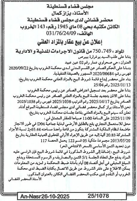 Il sera procédé à la vente au plus offrant et dernier enchérisseur le :