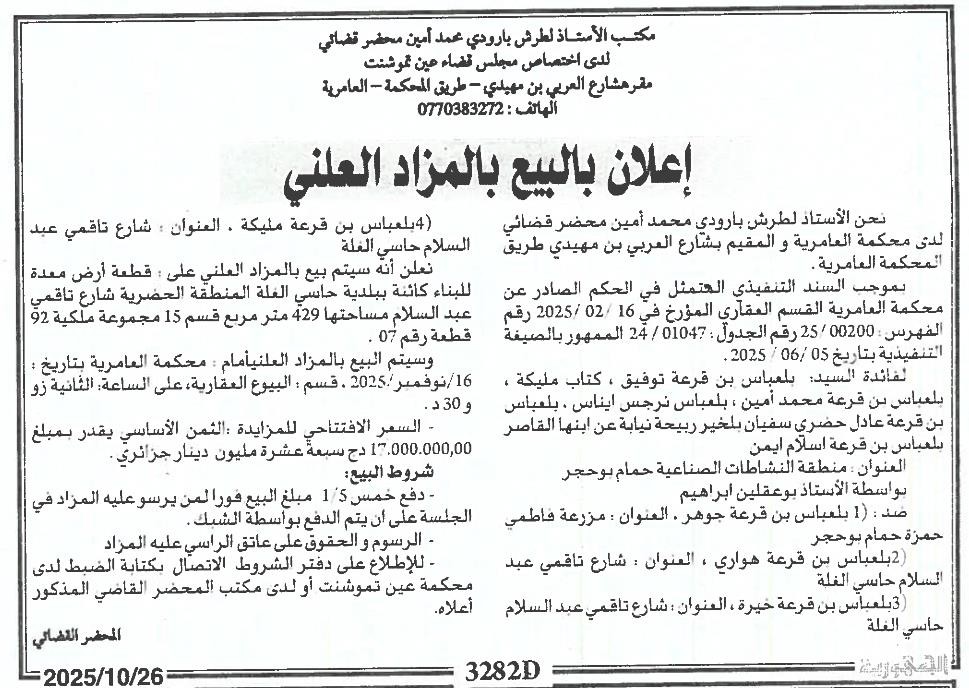 Il sera procédé à la vente au plus offrant et dernier enchérisseur le :