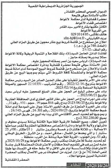 Il sera procédé à la vente au plus offrant et dernier enchérisseur le :