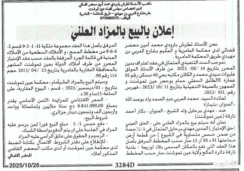 Il sera procédé à la vente au plus offrant et dernier enchérisseur le : 01/12/2025