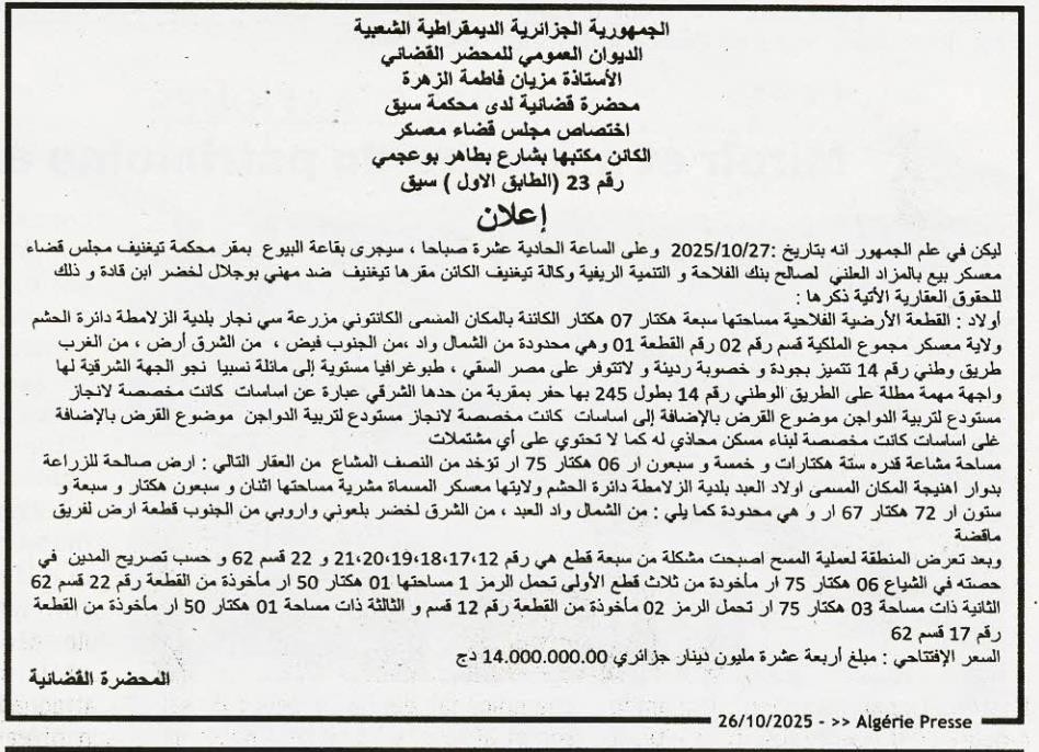 Il sera procédé à la vente au plus offrant et dernier enchérisseur le : 27/10/2025';