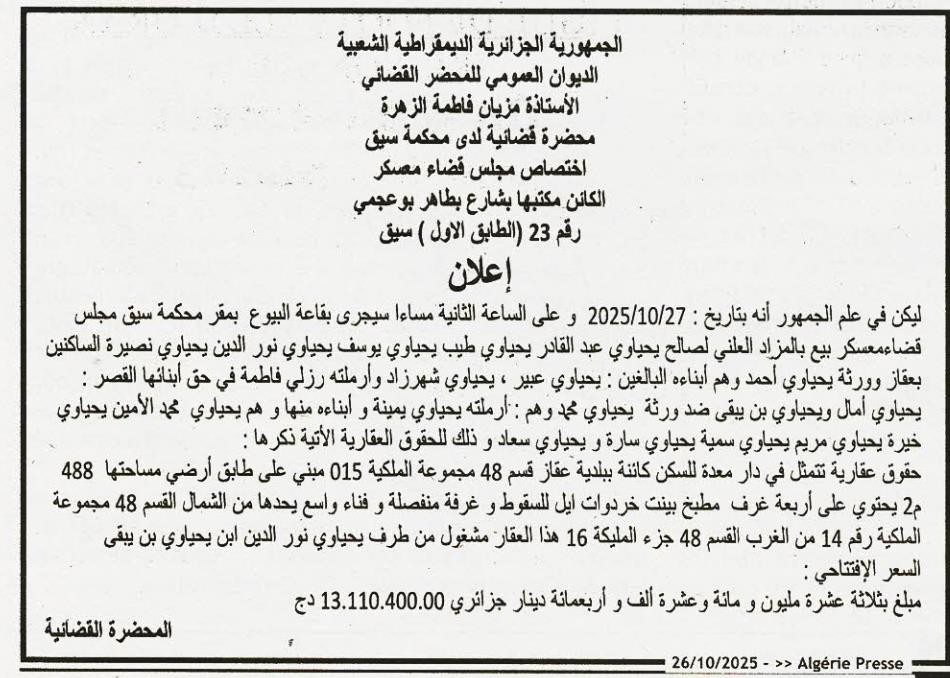 Il sera procédé à la vente au plus offrant et dernier enchérisseur le :