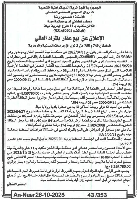 Il sera procédé à la vente au plus offrant et dernier enchérisseur le :