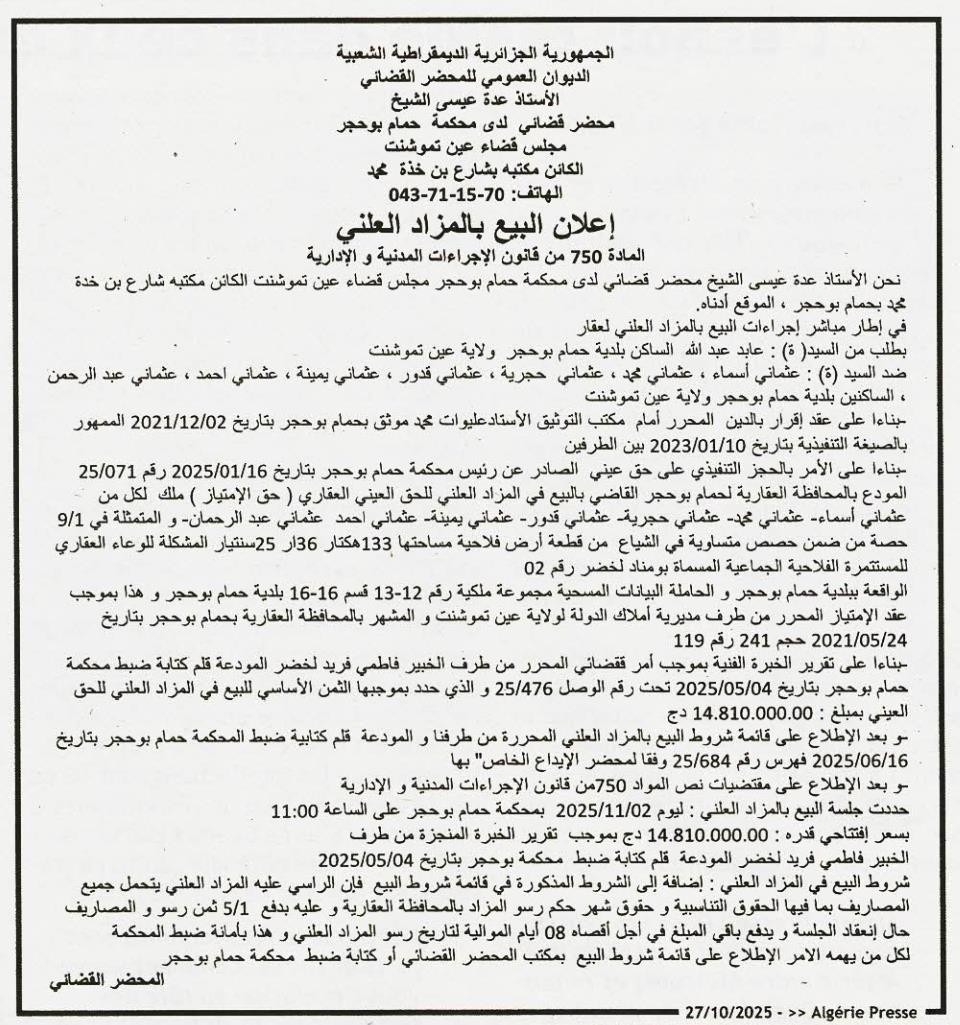 Il sera procédé à la vente au plus offrant et dernier enchérisseur le :