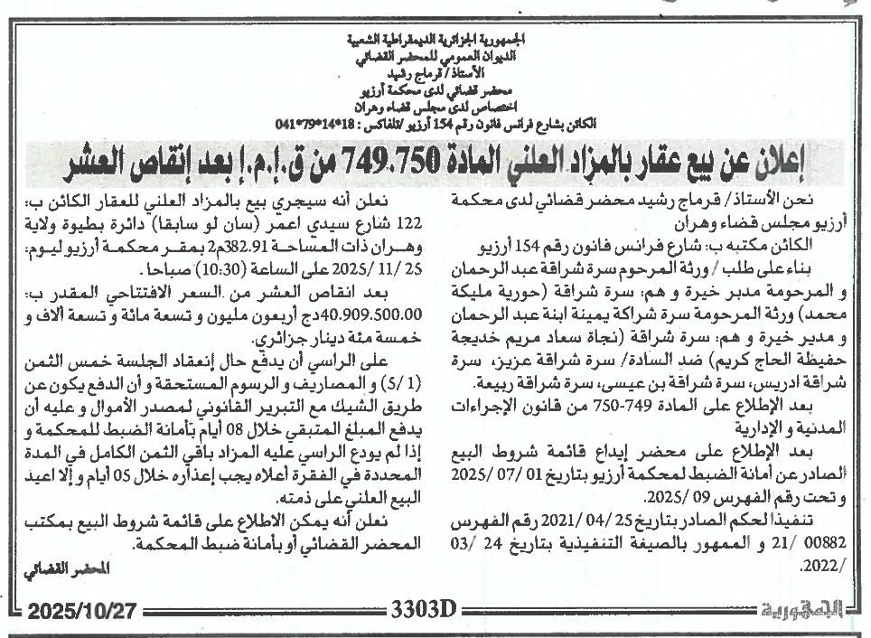 Il sera procédé à la vente au plus offrant et dernier enchérisseur le :