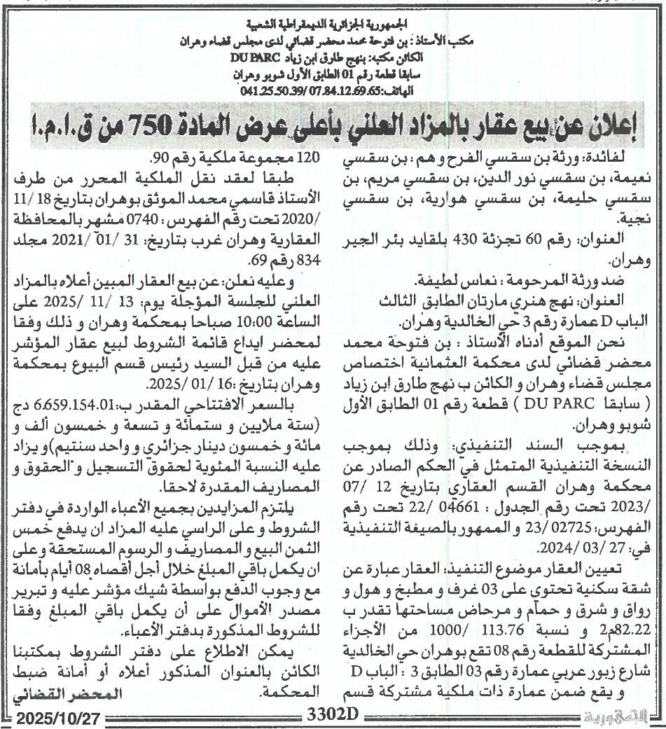 Il sera procédé à la vente au plus offrant et dernier enchérisseur le : 03/11/2025';