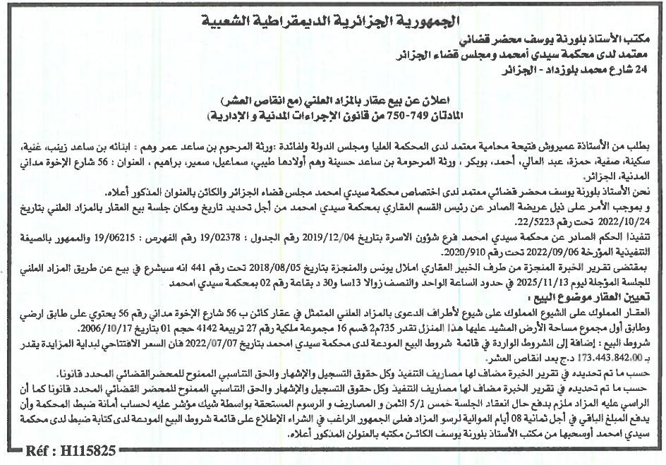 Il sera procédé à la vente au plus offrant et dernier enchérisseur le : 13/11/2025';