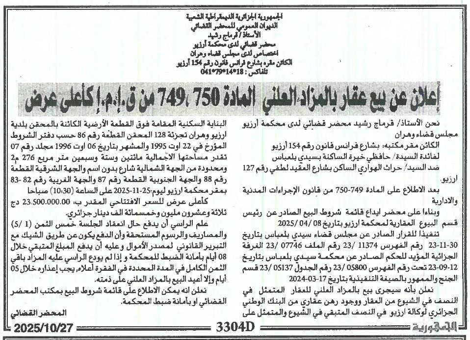 Il sera procédé à la vente au plus offrant et dernier enchérisseur le :